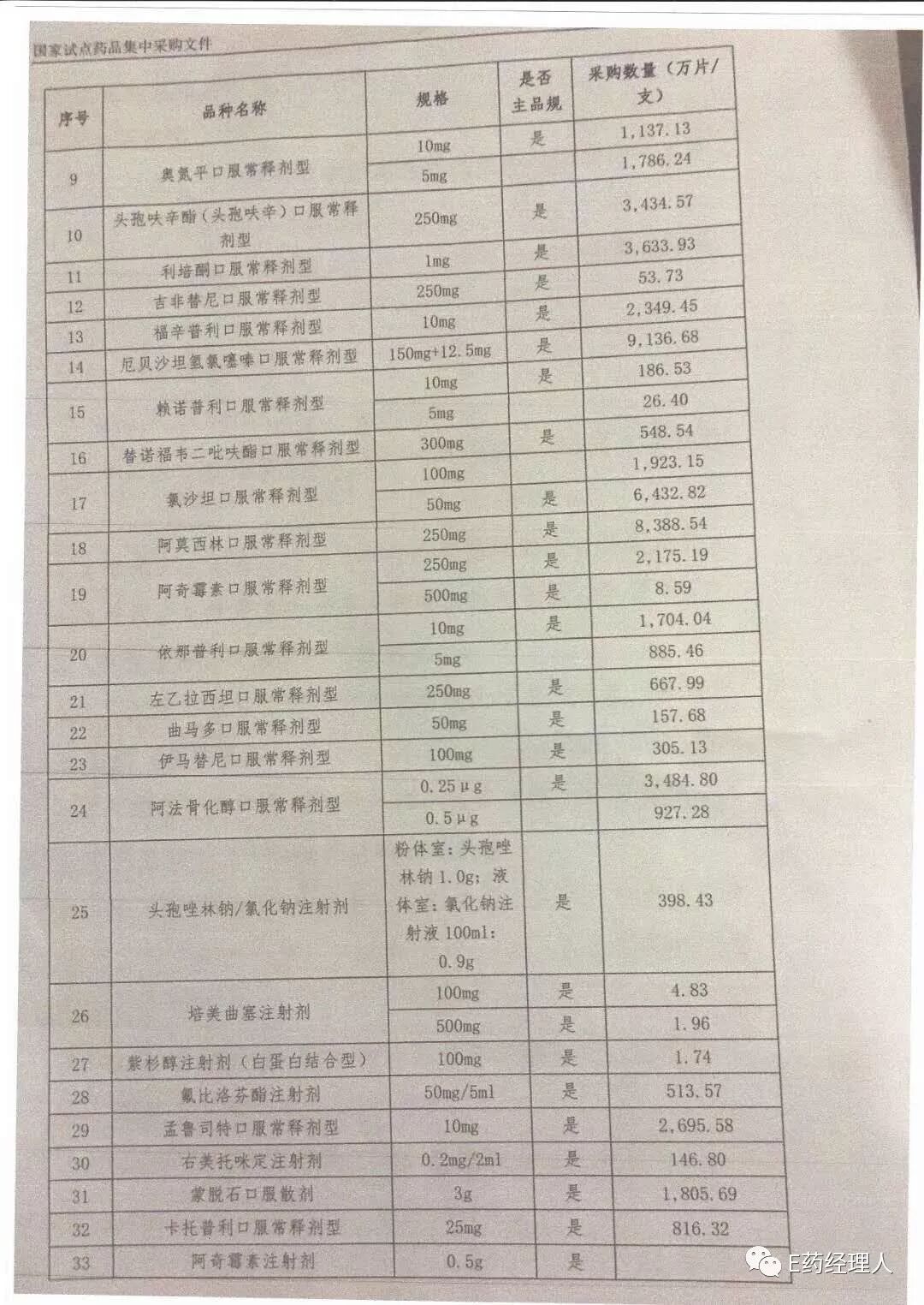 根据网传《国家试点药品集中采购文件》,此次试点采购品种达33个,并明确了药品规格和采购数量。试点地区将委派代表组成联合采购办公室(简称联采办)作为工作机构,代表试点地区公立医疗机构实施集中采购,日常工作和具体实施由上海市医药集中招标采购事务管理所承担。