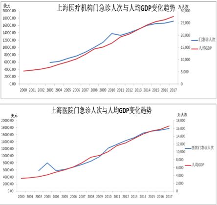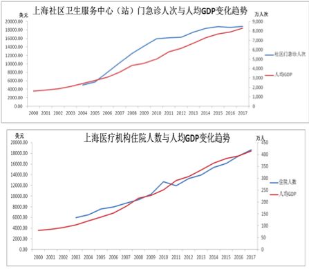 1、医疗服务需求随人均GDP增长而增长。从上海的医疗机构统计数据来看,不管是住院服务人次还是门急诊服务人次都随着上海人均GDP同步增长(包括了外地病人)。