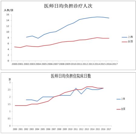 4、医生工作量日益增加。2016年,上海医院医师日均担负诊疗人次达14.8人次/日,高于北京等地水平(10.4人次/日),且远远高于全国平均值(7.8人次/日),上海医生工作量居全国首位。