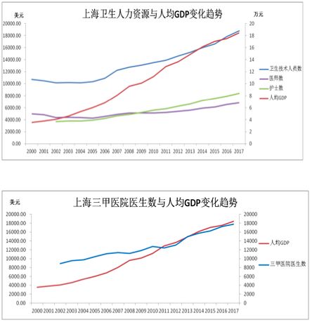 3、医疗卫生人力资源配置增长滞后于人均GDP增长和医疗需求增长。卫生技术人员、执业医师、护士的增长速度均远远小于人均GDP增长速度。2016年,上海千人口卫生技术人员、千人口执业医师、千人口护士数分别为7.4、2.6和3.3,均明显少于北京(10.8、3.9和4.5).