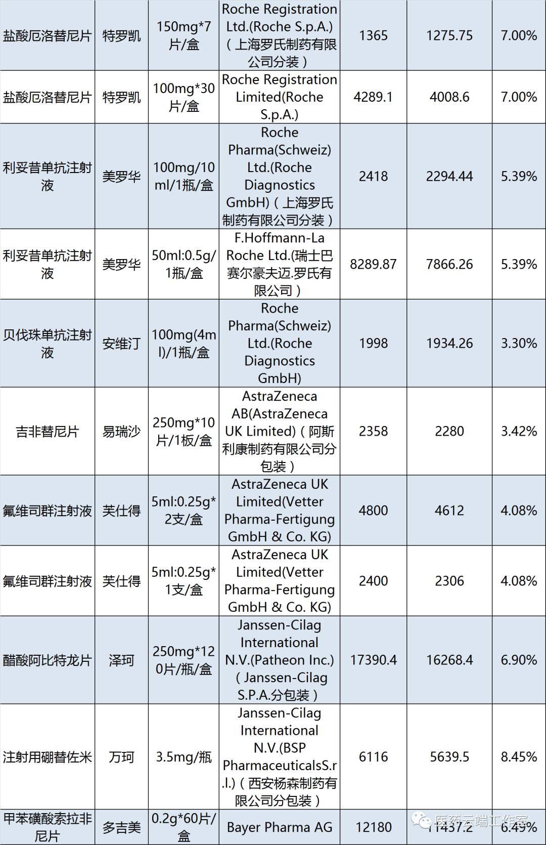 本次进行降价的共有20个品种,其中涉及多个抗癌重磅产品,如格列卫、特罗凯、易瑞沙和美罗华等,降幅在1%——9%之间。降幅最大为西安杨森的骨髓瘤用药万珂(通用名:注射用硼替佐米),调整后下降8.45%;而诺华的格列卫(通用名:甲磺酸伊马替尼片)降幅最小,仅为1.51%。
