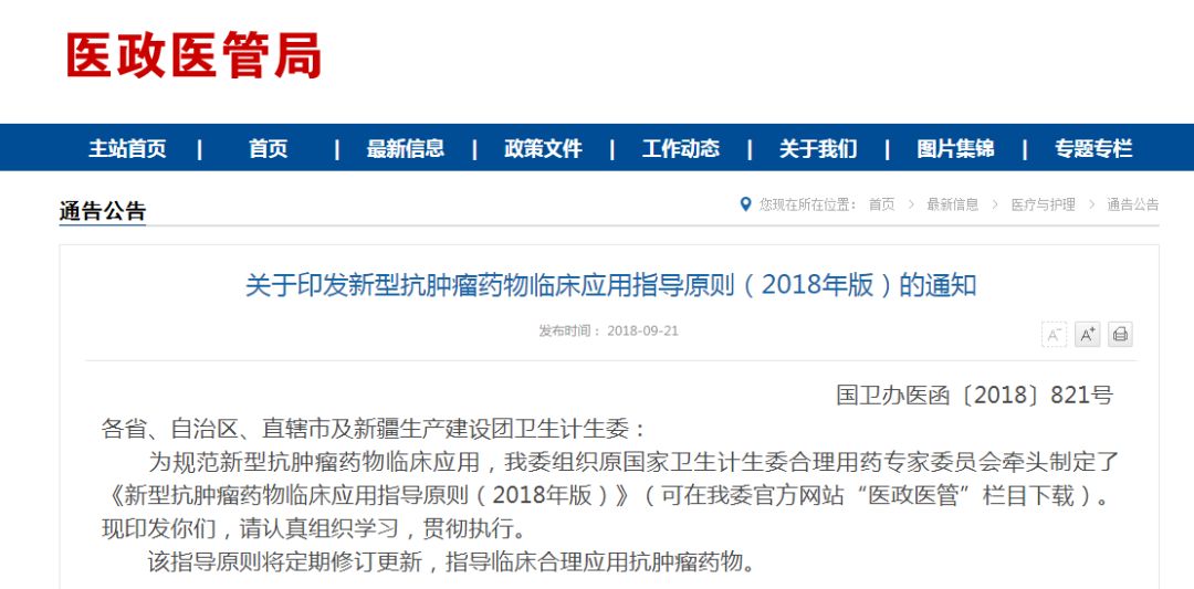 日前,国家卫健委医政医管局发布《关于印发新型抗肿瘤药物临床应用指导原则(2018年版)的通知》。