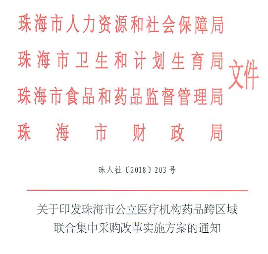 早在今年9月4日,珠海市人社局印发《公立医疗机构药品跨区域联合集中采购改革实施方案通知》。