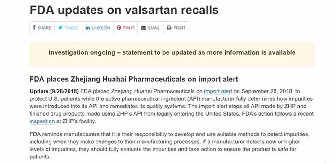 该警报的大致内容为:FDA在2018年9月28日将浙江华海药业以警戒进口处置,以保护美国患者,而这是基于原料药制造商须完全确定杂质是如何被混进原料药中的,并对其质量体系进行补救。