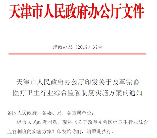 日前,天津市人民政府印发通知,将改革完善本市医疗卫生行业综合监管制度。