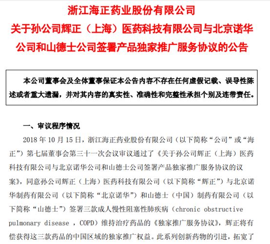 根据海正药业发布公告显示,海正的孙公司辉正(上海)医药科技有限公司与北京诺华公司和山德士达成协议,诺华的三款成人慢性阻塞性肺疾病治疗药品授予辉正在中国区域的独家推广权。