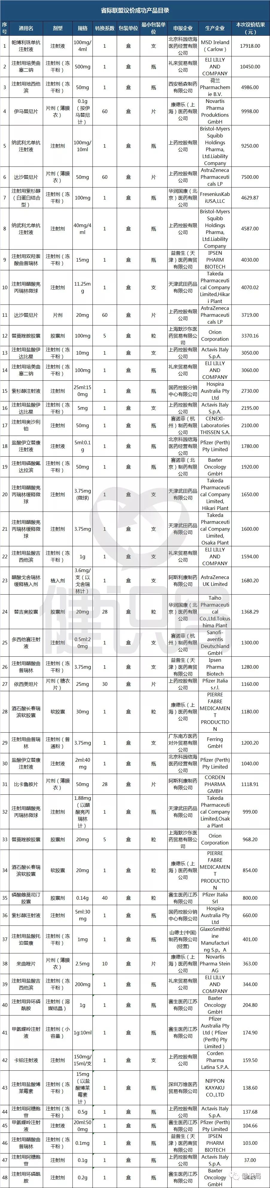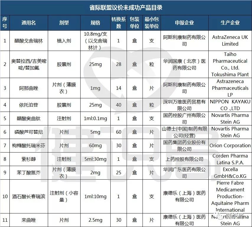而阿斯利康的诺雷德(醋酸戈舍瑞林植入剂)等11个品种议价未成功;诺华的格列卫(甲磺酸伊马替尼胶囊)等17个品种(29个品规)未申报参加。