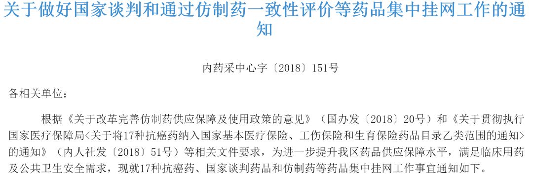 10月19日,内蒙发布通知,将17种抗癌药、36种国家谈判药品以及过一致性评价药品进行集中挂网。