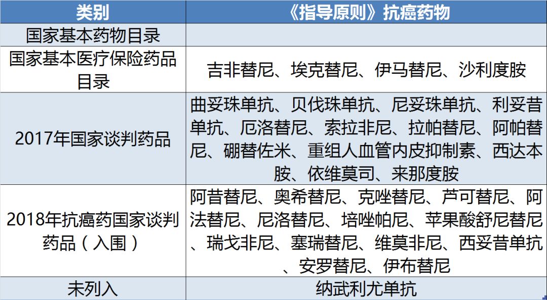 有意思的是,分类标准是根据药物是否进入三个与医保支付密切相关的药物目录来考量的,并且绝大多数为2017年国家谈判药品和2018年抗癌药国家谈判入围品种(见表4)。唯一未列入药物目录的品种是今年6月刚获得批准的创新机制首个PD-1抑制剂纳武利尤单抗。
