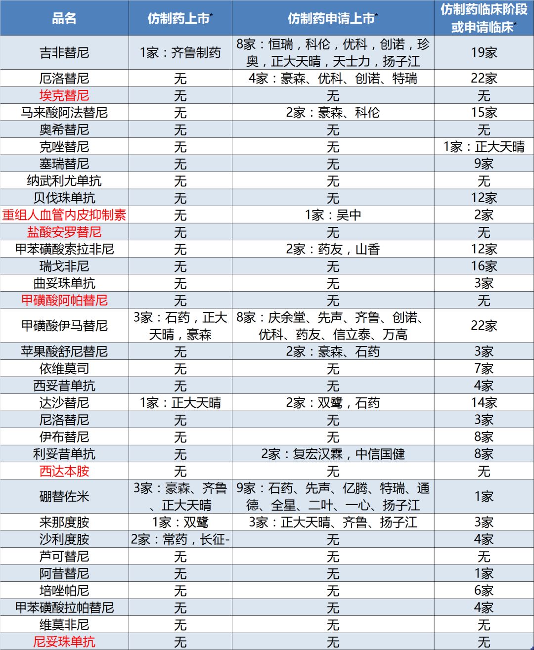 注:1、仿制药,包括大分子药物的生物类似药;2、标红为国产药企原研产品