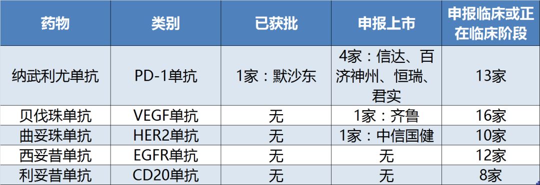 对于其中的大分子单抗药物而言,一些靶点,如PD-1、VEGF、HER2、EGFR和CD20也是当仁不让的开发热点,绝大多数有超过10家公司正在积极开发针对该靶点的产品(表6)。