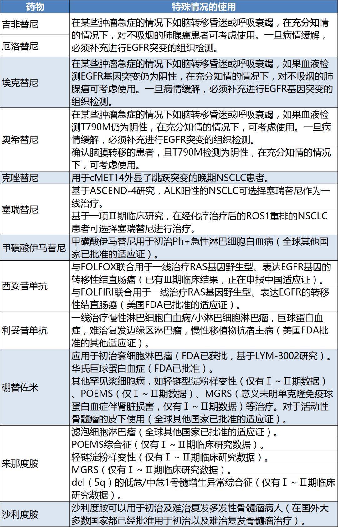 此次《指导原则》所涉及的33种药物中,有12个药物列明了特殊情况下的超适应症使用(表2)。特别值得一提的是,沙利度胺的说明书适应症仅为麻风病,并不是抗肿瘤药物,但被作为抗肿瘤药物列入《指导原则》,用于初治及难治复发多发性骨髓瘤。 这一举措说明,在严格用药管理的同时,卫健委正积极与国际最新研究接轨,推动国外已获批的适应症在国内的应用。