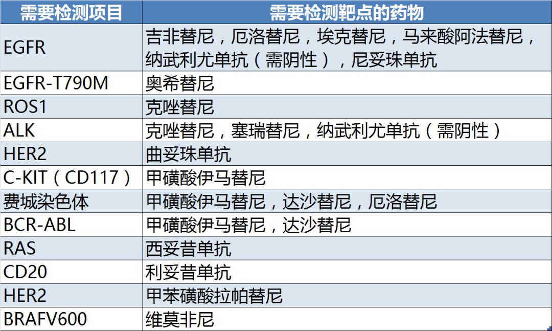 在应用指征上,《指导原则》明确指出,靶向药物必须经过国家药品监管部门批准的基因检测后方可使用,不得在未做相关检查的情况下盲目用药。《指导原则》明确列出必须进行基因检测的药物以及所需检测的项目(表1)。