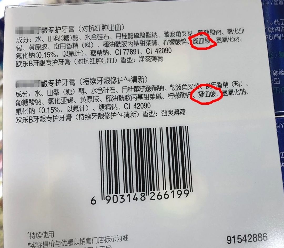 没有在“抗过敏减少牙龈出血”的牙膏上发现氨甲环酸,先不要高兴得太早。小编在另一款同样有“抗红肿出血”的牙膏成分里,发现了它——凝血酸。