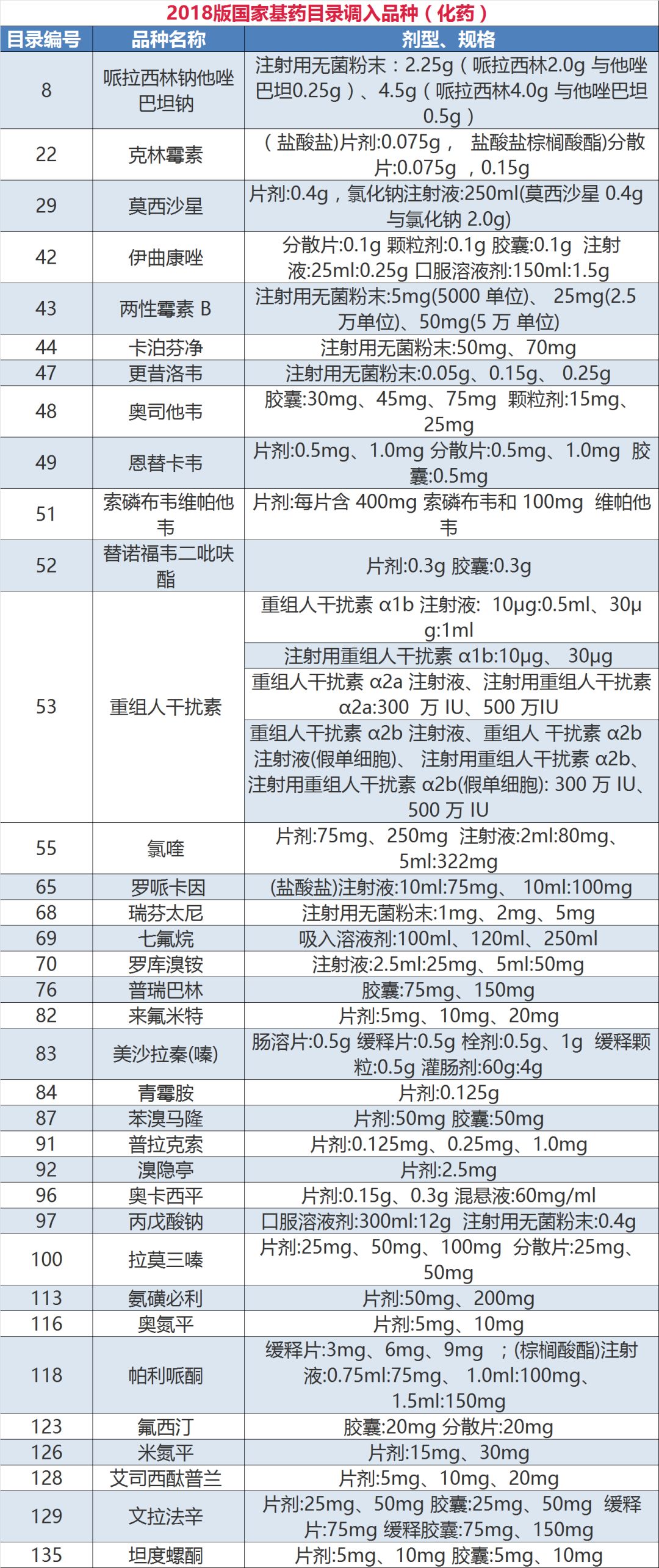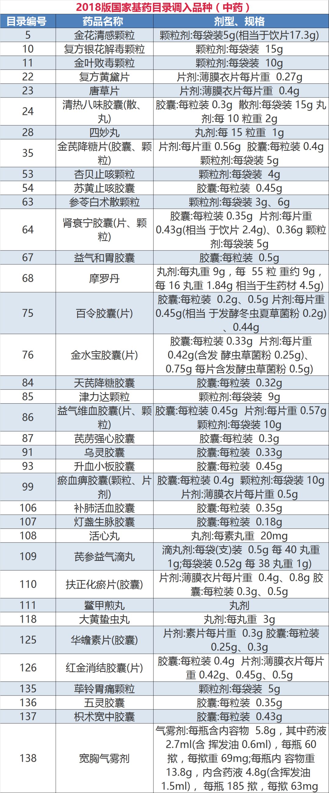 《国家基本药物目录(2018版)》已于10月25日正式印发,自2018年11月1日起施行。本次目录调整,坚持调入调出并重,中西药并重,共调入药品187种,调出22种,目录总品种数量由原来的520种增加到685种,其中西药417种、中成药268种。