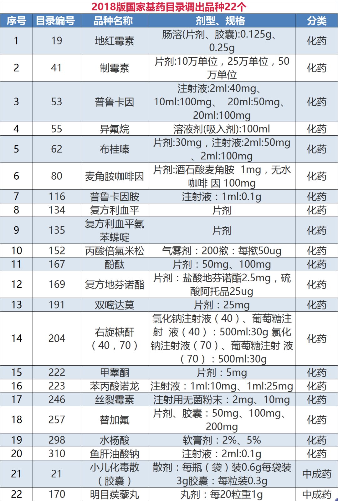 对一些上市时间较早,临床可替代,成本效益比低的品种新版目录进行了剔除,如复方利血平氨苯蝶啶、替加氟和丝裂霉素等。