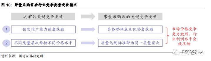 带量采购之后,行业关键竞争要素从销售推广能力变成具备整体成本优势的能力, 市场竞争将会更加激烈,行业利润水平将被压缩。