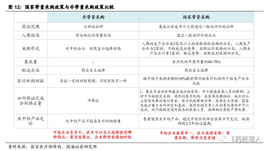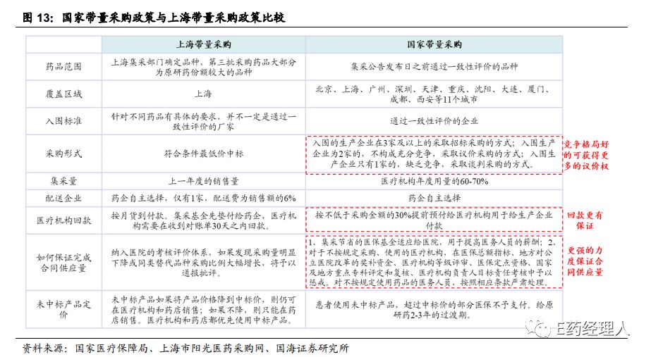 国家带量采购政策在参考上海市带量采购政策的基础上,做了一定程度上的修改和完善,是对现有非带量招标采购政策的重大改革,相比现有非带量采购政策,带量招标采购体系下,中标企业数量单一,降价力度更强;而相比上海市带量采购政策,又有以下几个特点:1)竞争格局好的品种可获得更多的议价权; 2)更强的力度保证合同供应量;3)回款更有保证。