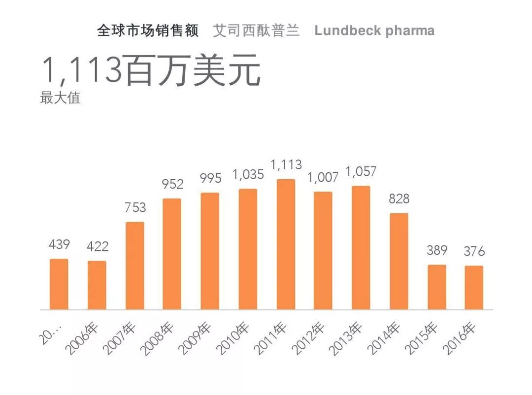 艾司西酞普兰,是一种选择性的 5-HT 再摄取抑制剂,主要用于治疗抑郁障碍、惊恐障碍。资料显示,其临床疗效优于西酞普兰,上市后很快成为抗抑郁首选药物,在全球的市场份额达到11亿美元。