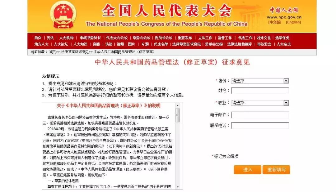 11月1日,《药品管理法》修正草案在中国人大网公布,开始公开征求社会各界意见,征求意见截至时间为2018年12月1日。