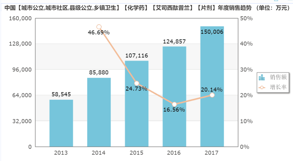 根据米内网数据库,2017年草酸艾司西酞普兰片在全国公立医院销售额为15亿元,市场增长率高达20.14%,从近几年草酸艾司西酞普兰片能够保持高速增长的态势,可见该品未来的市场仍然非常值得期待。