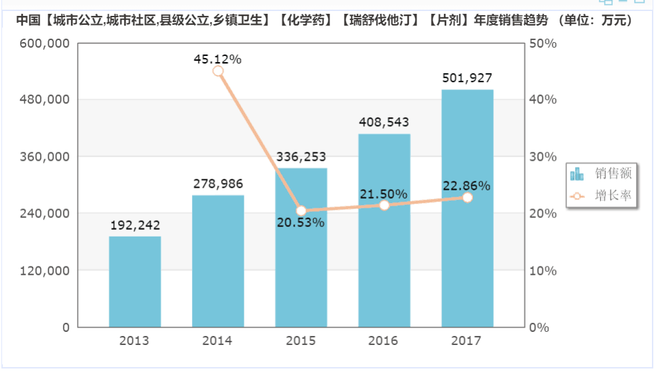 根据米内网数据库,瑞舒伐他汀钙片2017年在全国公立医院市场规模高达50.19亿元,市场增长率高达22.86%,且近几年保持持续保持高速增长。