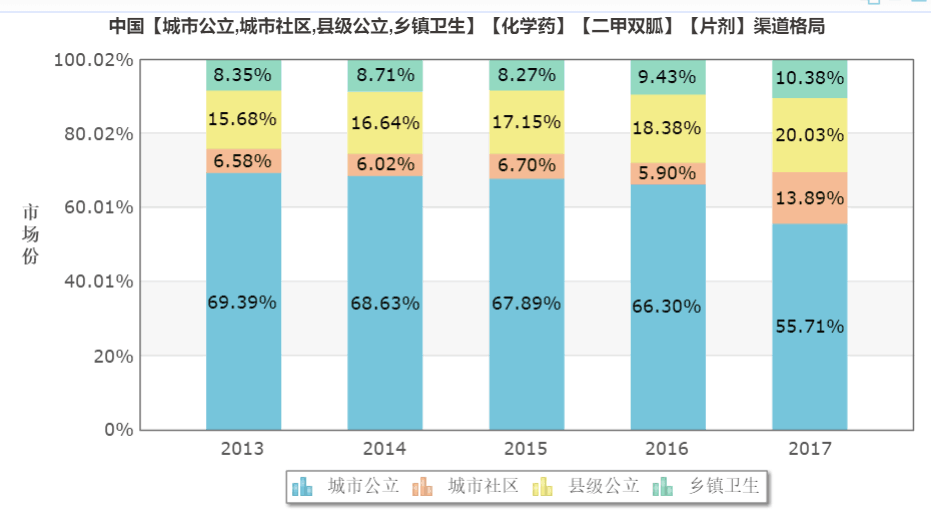 从二甲双胍在各级医院使用的情况看,其在基层医疗机构的市场占比越来越大。可见,在分级诊疗的政策下,作为慢病的糖尿病病人,已经明显往基层下沉。