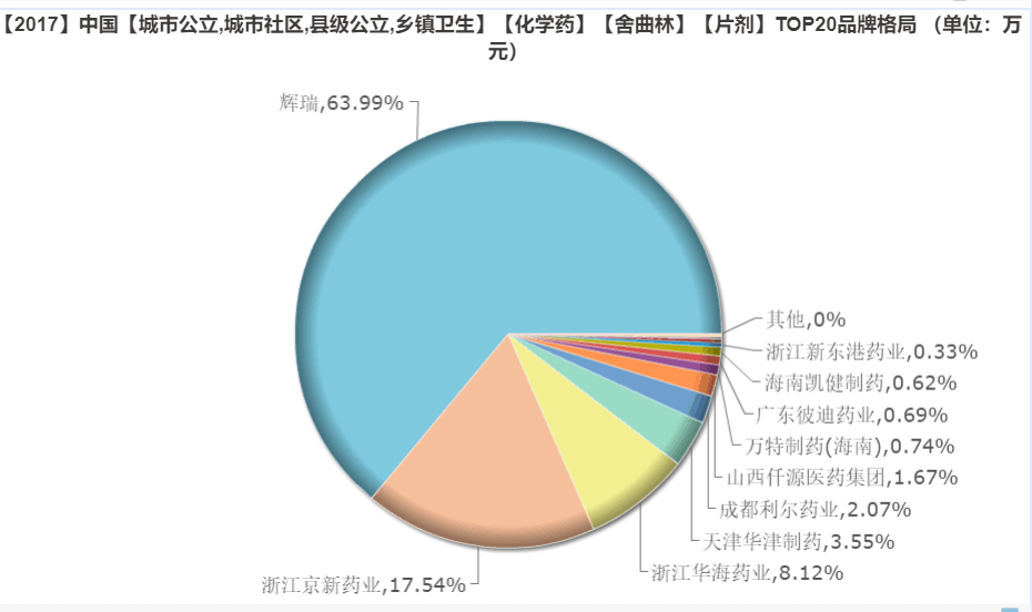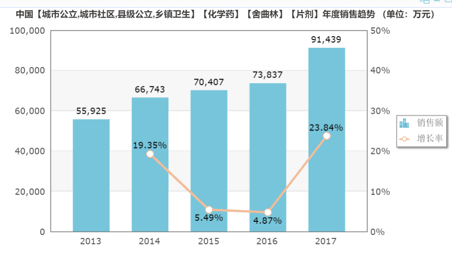 根据米内网数据库,2017年盐酸舍曲林片在全国公立医院销售额为9.14亿元,市场增长率高达23.84%,可见近年来盐酸舍曲林片无论从市场需求、增长潜力方面,都非常的值得关注。