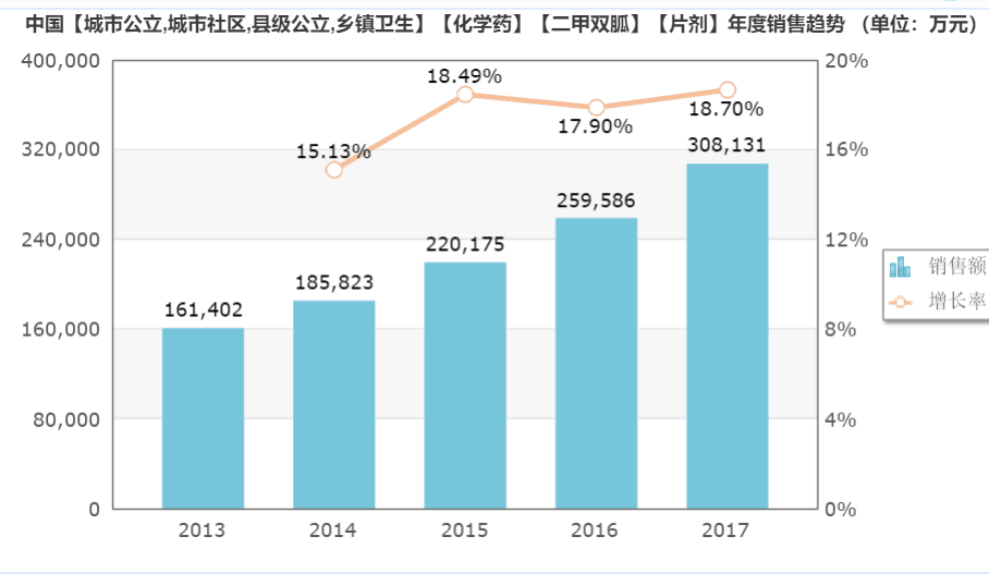 米内网数据库显示,2017年二甲双胍片在全国公立医院销售额为30.81亿元,市场增长率达到18.7%,为国内口服降糖药通用名市场规模第二的药品。