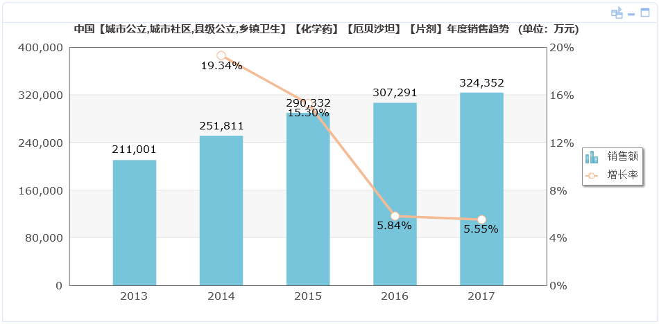 根据米内网数据库,2017年厄贝沙坦片在全国公立医院销售额为32.42亿元,市场增速逐渐放缓。