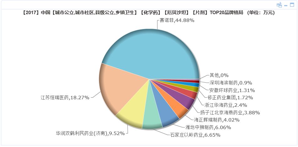 从厄贝沙坦片的市场格局数据我们可以看到,作为原研药的赛诺菲仅占有不到一半的市场,江苏恒瑞、华润双鹤、石家庄以岭等本土药企对市场瓜分十分明显。