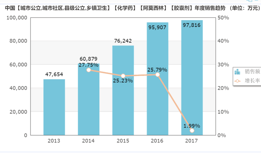 米内网数据库显示,阿莫西林胶囊的市场增长率从2014年到2016年的20%以上,下降到2017年的1.99%,增长速度大幅放缓。2017年市场规模为9.78亿元。
