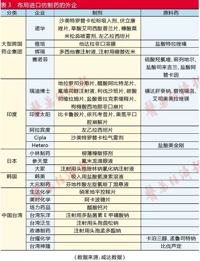 国内公司也积极引进进口产品,如沙美特罗替卡松粉吸入剂,亿腾医药(苏州)打算引进,江苏先声和Celon Pharma S.A也打算引进。印度企业Cipla和润东医药也联合申报了沙美特罗替卡松气雾剂。此外,山东绿叶制业引进Luye Pharma的利斯的明透皮贴剂;人福普克引进苯磺酸氨氯地平片、氢溴酸西酞普兰片。