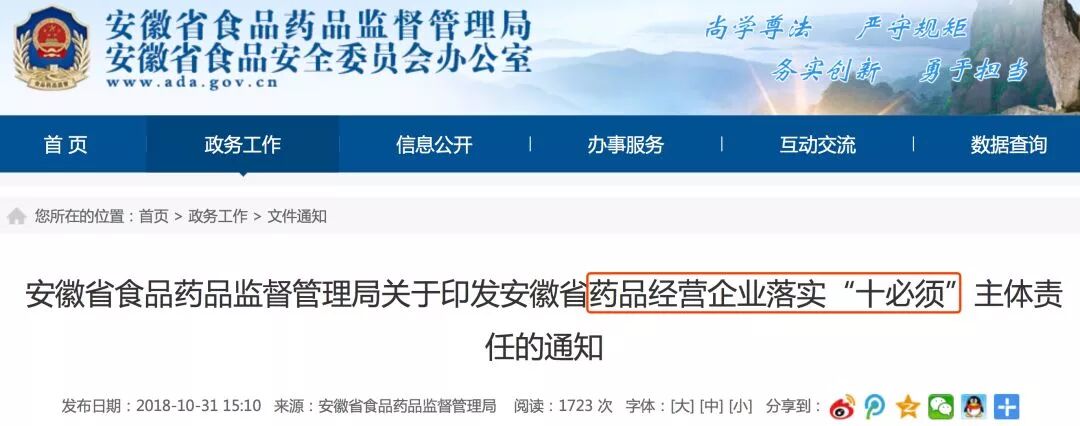 10月31日,安徽省食药监局发布通知,要求全省药品经营企业落实“十必须”主体责任。