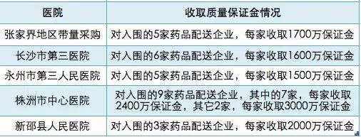 此前,据赛柏蓝报道:近些年来,湖南省一些公立医疗机构在遴选药品配送企业时,收取数额巨大的的质量保证金,是非常普遍的现象。从地区带量采购,到三甲医院,甚至县级医院,都是如此。(部分情况见下表)。
