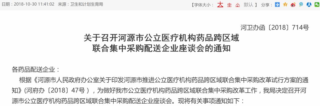 今日(10月30日),河源市卫计委发布通知,将于2018年11月1日下午召开药品跨区域联合集中采购配送企业座谈会,要求具备覆盖河源地区药品配送能力,且有意愿参加药品跨区域联合集中采购的各药品配送企业有关负责人1-2名来参会。