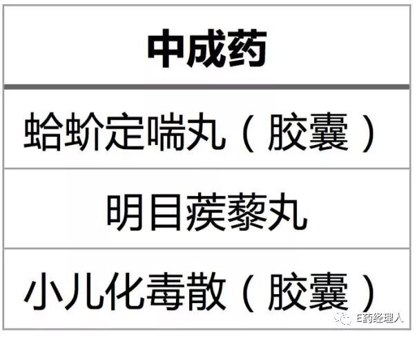 本次在在中药品种方面调出的不多,只有有蛤蚧定喘丸(胶囊)、小儿化毒散(胶囊)和明目蒺藜丸三个品种出局。