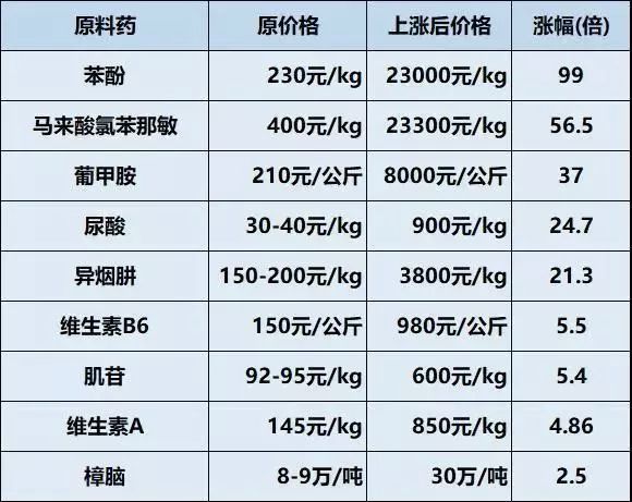 从 2017 年年底开始,由于原材料短缺等一些列外部原因,导致药品原材料价格一路飙升,某些原材料价格甚至涨幅找过 100 倍。