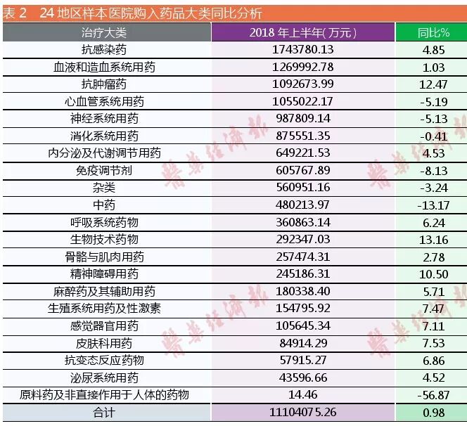 不过,企业除了需要关注其文件的精神与描述的变化外,还要关注诱导市场发生变化的其他因素。2018年上半年样本医院用药市场中抗感染药物购入总金额的增长率远高于平均增长率,导致这个现象的原因是年初国内发生大面积流感、抗感染药物使用增加。此外,该大类药在样本医院购入药品总金额多年来一直还是排在第一位(详见表2)。这既说明抗感染药物虽然在医院使用分级管理已成常态化,但在遇到大病大灾时卫生部门还是以救死扶伤为第一,允许使用临床治疗必需的抗感染药物;又说明此大类药物在临床治疗上疗效已被医生与患者认可,是不可缺少的。