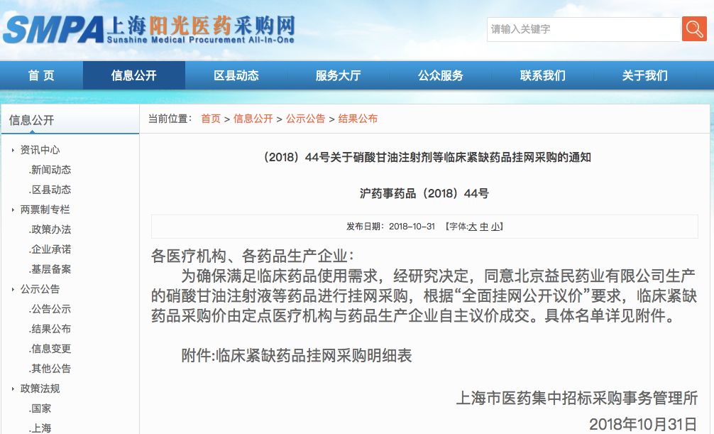 今日(10月31日),上海阳光医药采购网发布《关于硝酸甘油注射剂等临床紧缺药品挂网采购的通知》,有24个临床紧缺药品将进行挂网采购。