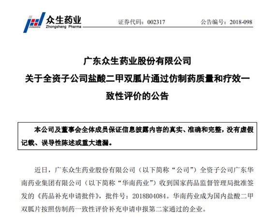 11月14日,众生药业发表公告,其全资子公司广东华南药业的盐酸二甲双胍片通过仿制药一致性评价申请,成为该品种申报第二家通过的企业。