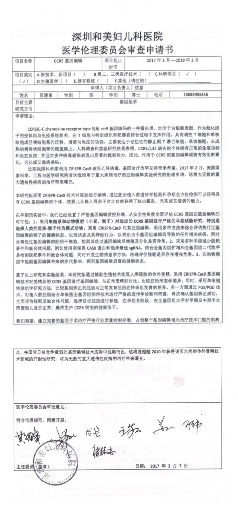 根据《赛先生》报道,有相关网站披露,这项临床试验已经通过深圳一家医院的伦理委员会审批,并在中国临床试验注册中心完成注册登记。据披露的申请书显示,期望建立完善的基因手术治疗严格行业质量控制标准,“占领整个基因编辑相关治疗技术门槛的制高点,在国际日益竞争激烈的基因编辑技术应用中脱颖而出。” 业内也有人表示,深圳和美妇儿科医院是莆田系医院。