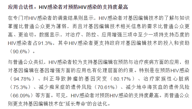 575份HIV 携带者问卷显示,有94.78% 的HIV 携带者支持基因编辑技术用于预防HIV 。另据美国皮尤研究中心2018年4月针对2537名美国成年人的一项调查显示,60% 的美国人支持对未出生婴儿进行基因编辑,认为为了降低患严重疾病的风险,基因编辑是一种有效的医疗手段。