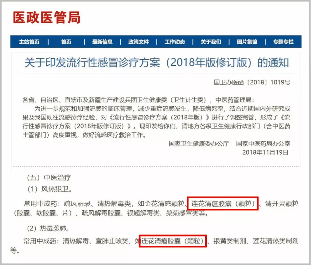 连花清瘟胶囊(颗粒)入选《流行性感冒诊疗方案(2018年版修订版)》